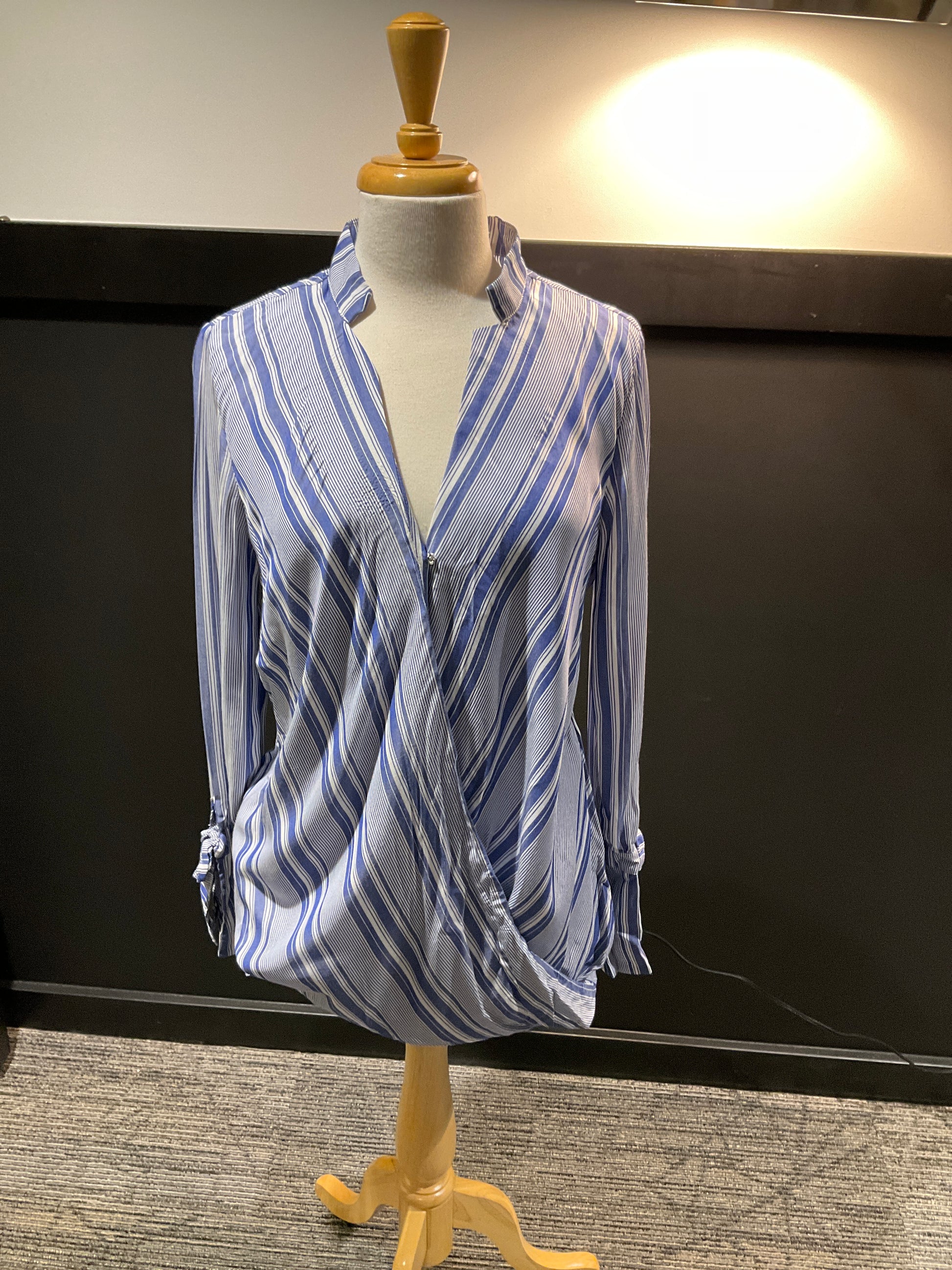 This Fourteenth Place Stripe V Neck Blouse offers a lightweight and comfortable fit with a stylish crossover design. Perfect for any occasion, this blouse boasts a flattering v-neckline and timeless striped pattern. Enhance your wardrobe with this versatile and trendy piece.